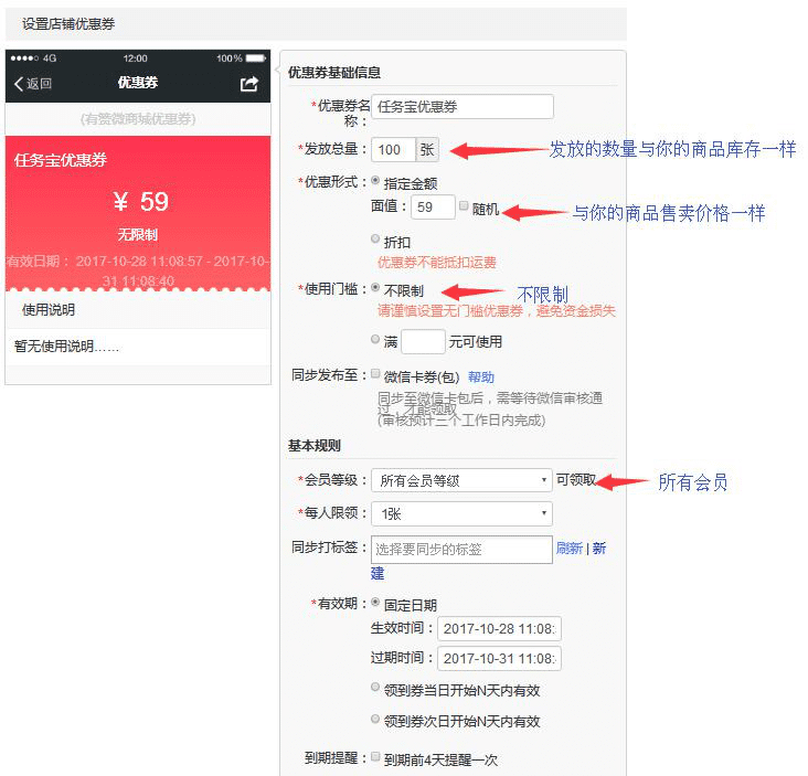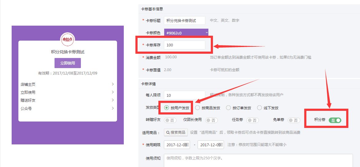 卡券库存:卡券库存需要与商品设置的库存一致。按用户发放与积分券一定要开启
