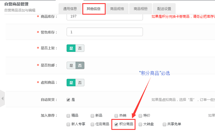 添加商品:跟添加积分商品一致,重要的一点是商品库存需要跟卡券库存一致。