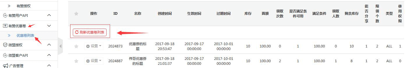 四、拉取有赞优惠券:系统设置->有赞优惠券->刷新优惠券列表