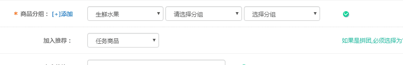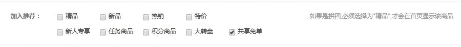 常用的商品显示:精品(显示在拼团首页)新品、热销、特价、显示在对应的档目中