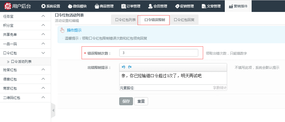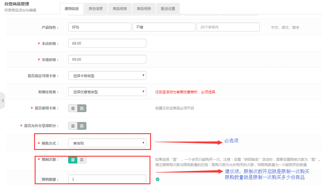 限制次数:打开后可以填写限购数量可以限制购买用户的购买次数