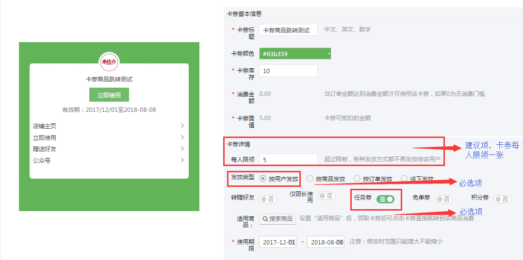 卡券库存:卡券库存需要与商品设置的库存一致,按用户发放与积分券一定要开启