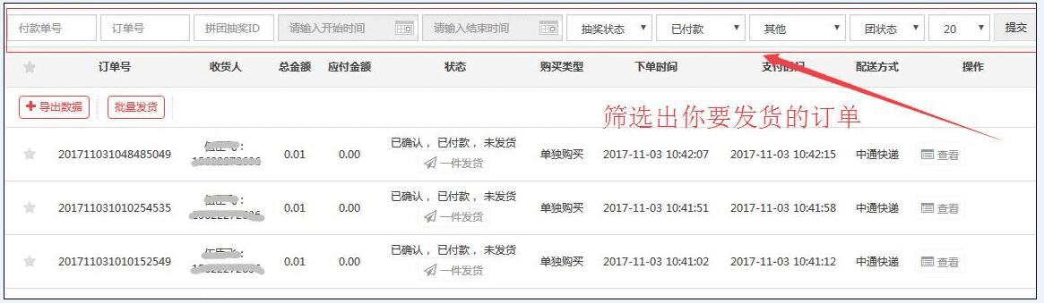 (1)筛选你要发货的订单或直接勾选你要发货的订单