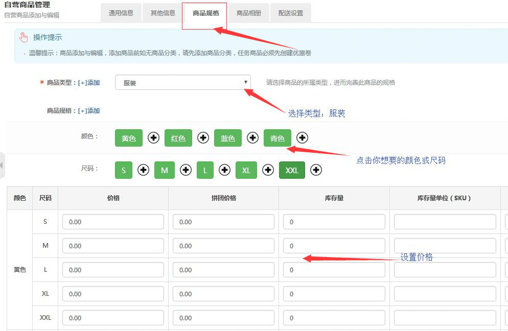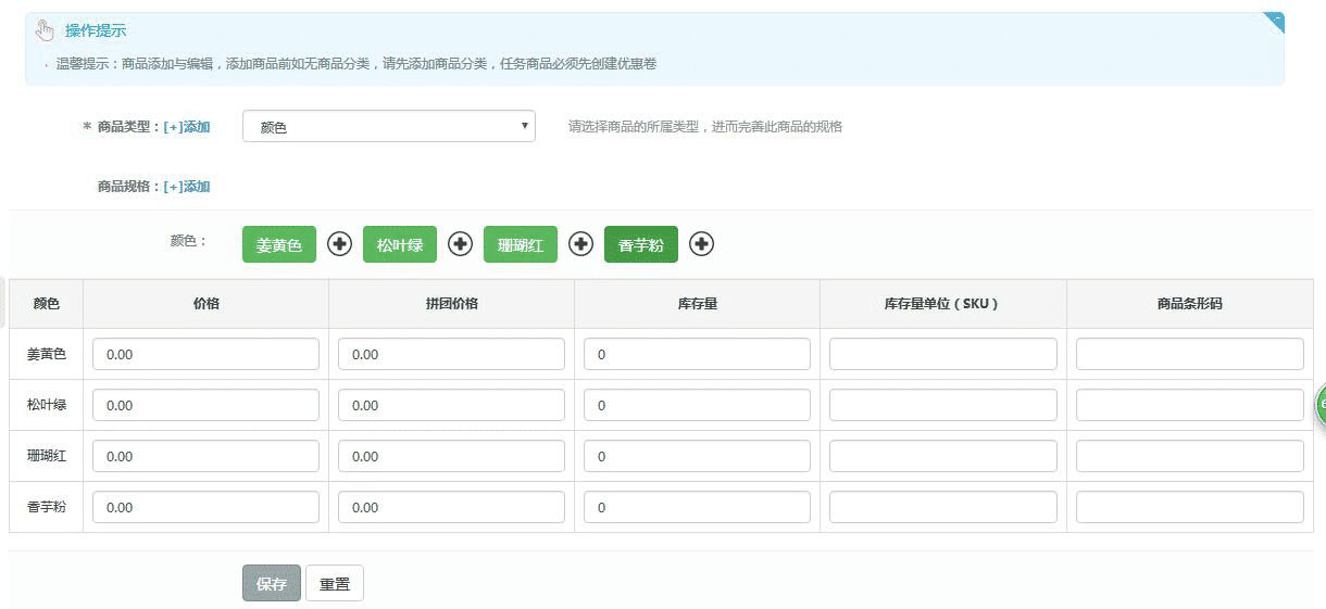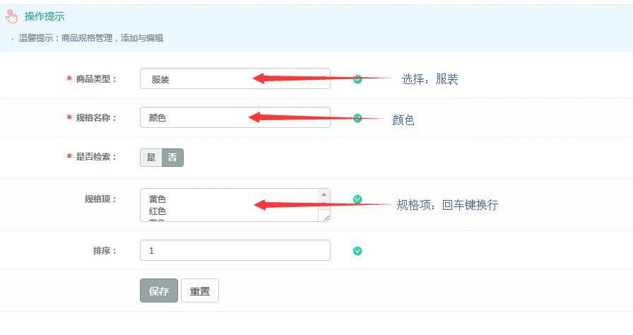 (1)设置商品规格前请先设置商品类型(可查看商品类型设置教程)
