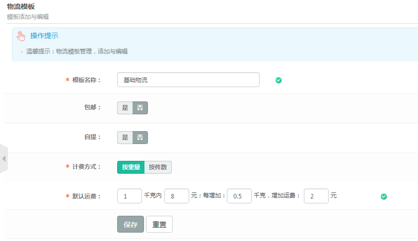 (1)模板分包邮/自提/运费自选(按重量、按件数)