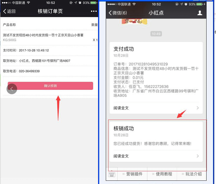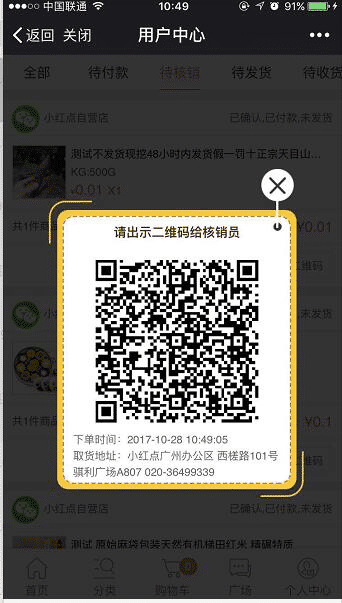 (6)商品如果运费设置中选择了自提方式,用户下单后如下图1,用绑定人员微信扫一扫就能核销,