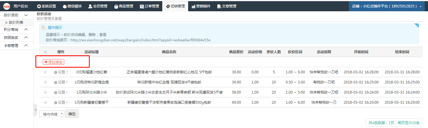 三、商品添加完成后进入:促销管理->砍价活动->砍价列表->添加砍价活动