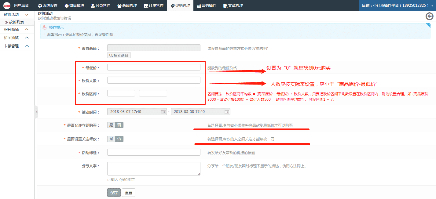 (2)最低价/砍价人数/砍价区间:需要按上图所示的设置