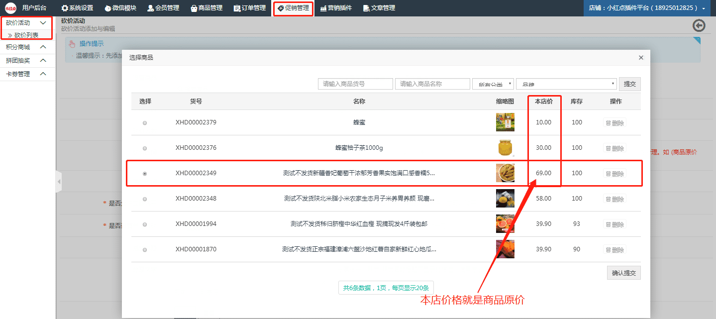 (注:如果你添加商品加入推荐里没有选择“砍价商品”在这里就会搜索不到同时要查看到商品原价)