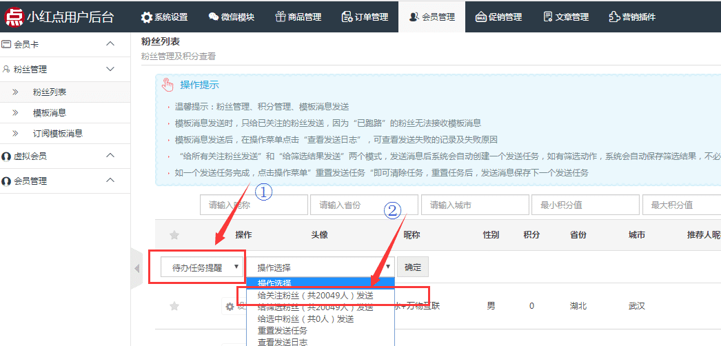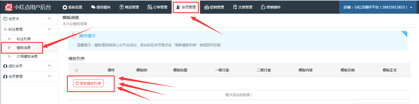 (3)小红点平台:会员管理-粉丝管理-模板消息-刷新模板列表