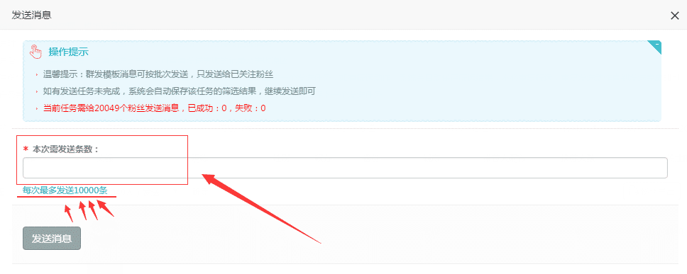 直接填写数字(1-10000)点击“发送消息”,系统就是开始发送第一波发完显示发放成功的人数,若粉丝数量大于所填的群发数需继续点击群发直到全部完成(系统会自动辨别是否已经发送)