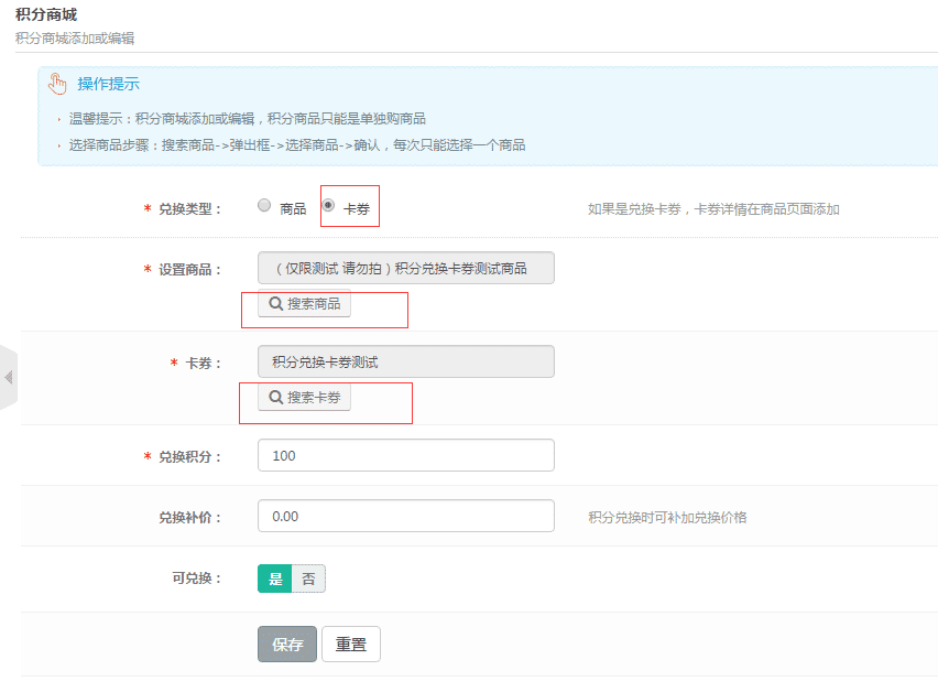 添加商品:跟添加积分商品一致,重要的一点是商品库存需要跟卡券库存一致。