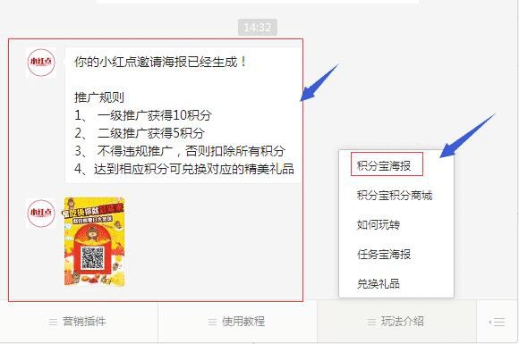 (2)积分宝海报获取方式有两种:1、自定义菜单获取方式,2、发送关键词“获取海报”获取方式。
