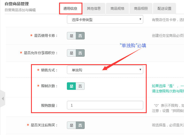1、自营平台商品设置:商品管理->自营商品->添加商品(注意项)