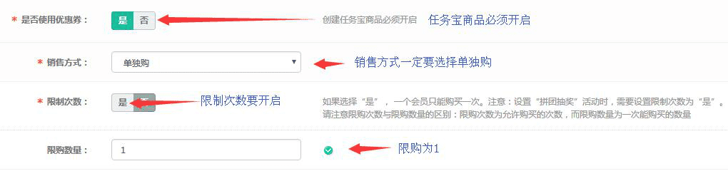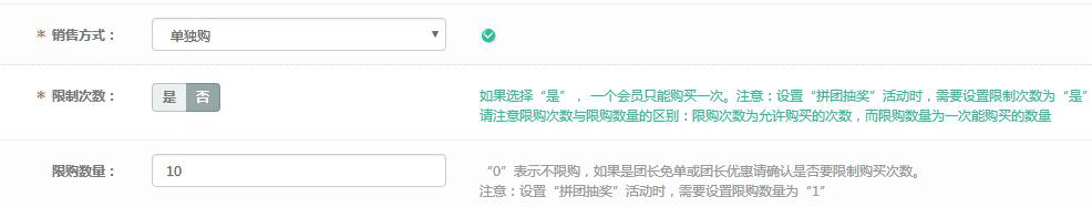 限制次数:打开后可以填写限购数量可以限制购买用户的购买次数