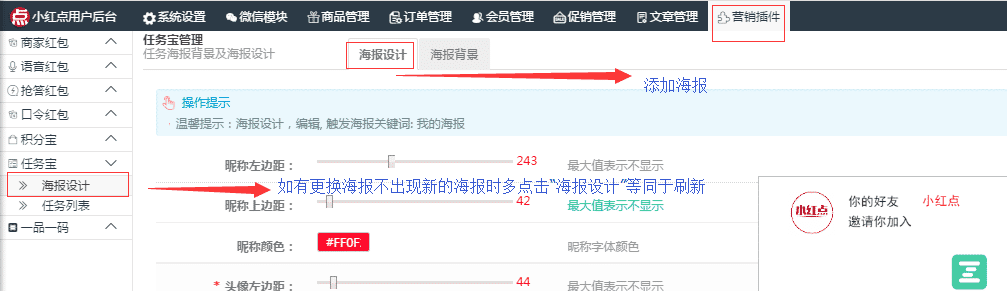 (1)积分商品设置完了后设置推广积分及海报:营销插件->积分宝->积分设置
