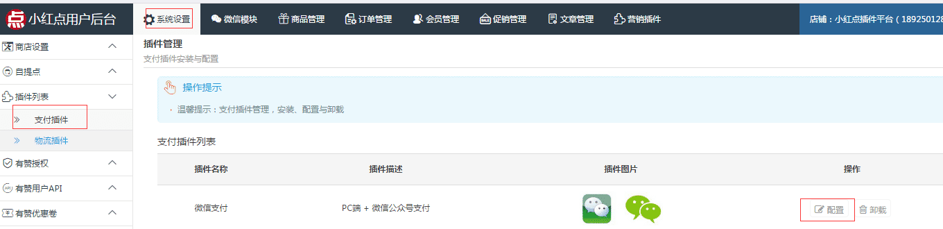 (8)返回店铺的后台,在系统设置里找到插件列表,打开分组,点击支付插件,在微信小图标右侧点击配置。