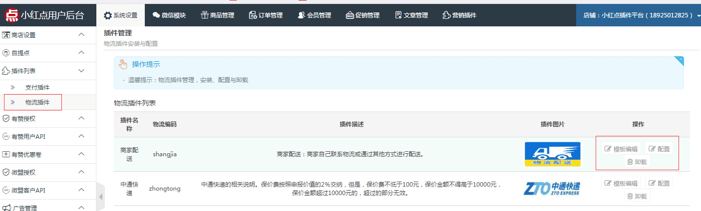 (3)物流插件:没有固定的物流快递可以选择商家快递, 若是需要设置上门自提(查看教程-自提及商品核销设置)