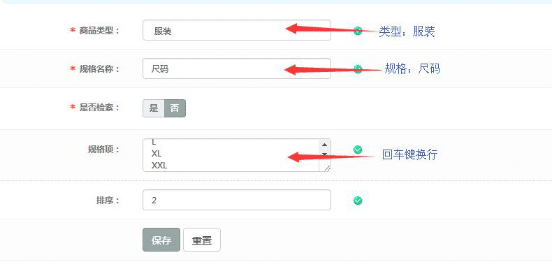 例:我们添加一个服装的类型规格,服装至少有两个规格,颜色及尺码;