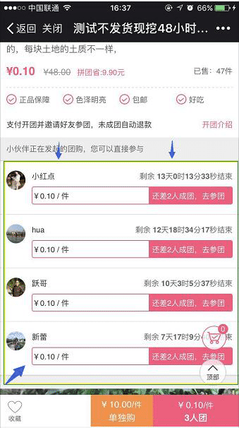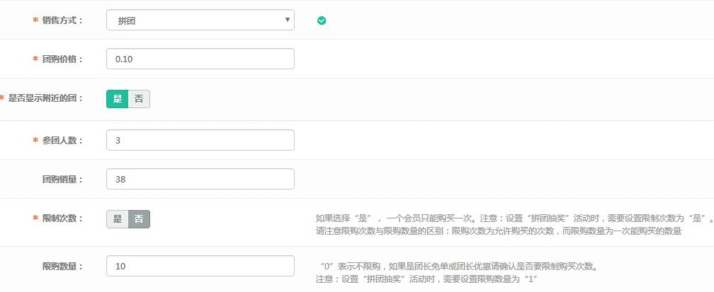 (15)团长优级惠:可以选择开团团长优惠;是否关注购买:如果选择是,粉丝购买必须关注后才能购买。
