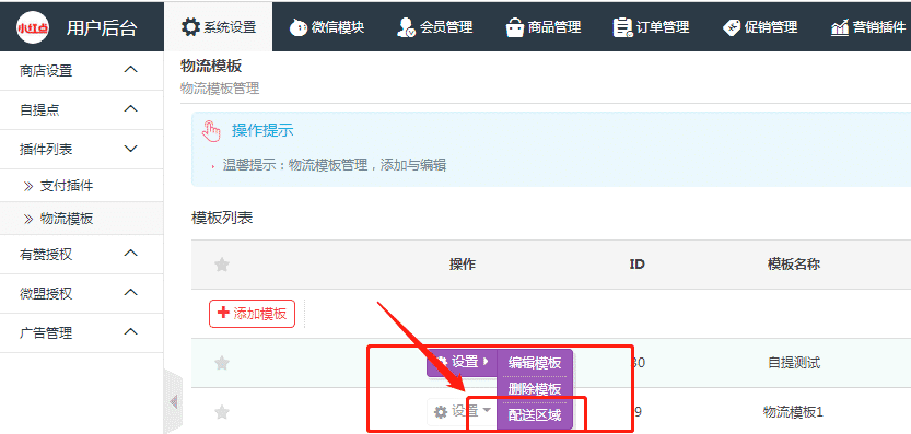 一、添加流程:进入后台->系统管理->插件列表->物流插件,添加模板 (设置运费物流前请先安装物流插件)