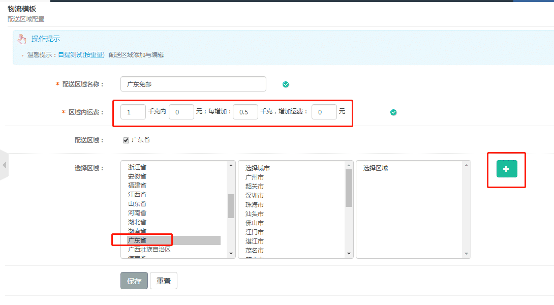 (2)如果是全国配送费用都一样,可不用新增配送区域,若是有部分地区需要免邮或者另外加运费:如下图设置