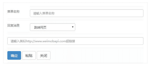 (2)微信自定义菜单里点击加号,在右侧输入你想命名的菜单名称和想跳转的网页或想回复的消息(如果想跳转网页,直接把网页的网址输入即可,回复消息同理),点击确定。