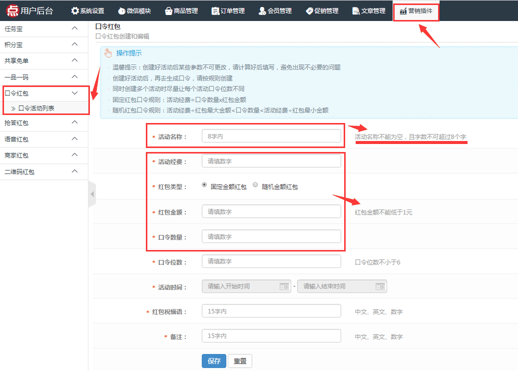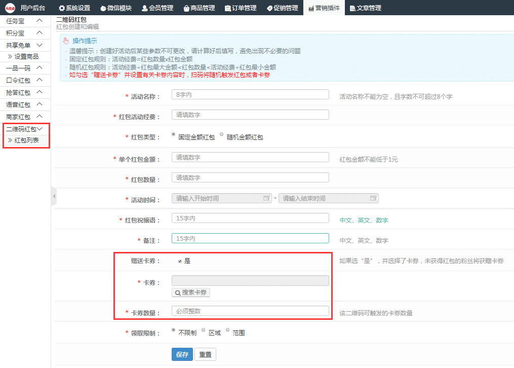(1)设置卡券:促销管理->卡券管理->添加卡券(标红框为必选项)