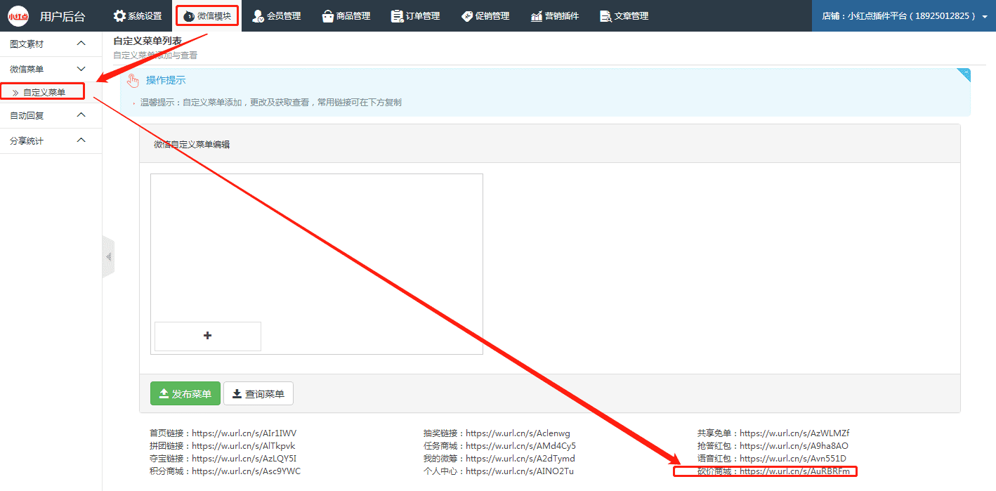 (1)获取海报:可以查看到海报效果,积分商城链接可以在微信设置->微信自定义菜单-查看